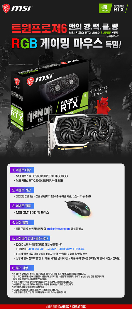 이번 행사는 2020년 2월 1일부터 2월 29일까지 ‘MSI 지포스 RTX 2060 SUPER 아머 OC 8GB’, ‘MSI 지포스 RTX 2060 SUPER 아머 8GB’를 구매하는 고객에게 화려한 RGB가 장착된 ‘MSI GM11 게이밍 마우스’를 증정한다. 준비된 경품이 모두 소진 시 행사는 자동으로 종료된다.