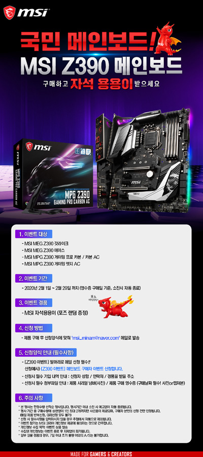 이번 이벤트는 2020년 2월 1일(토)부터 2일 29일(토)까지 진행하며(기간 중 구매 고객 대상, 소진시 자동종료), MSI Z390 메인보드 중 대상 제품을 구매한자를 대상으로 한다. 이벤트 경품은 최대 ‘MSI 자석용용이’를 선착순 증정한다.