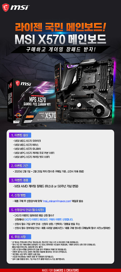 본 이벤트는 2020년 2월 1일(토)부터 2일 29일(토)까지 진행하며(기간 중 구매 고객 대상, 소진시 자동종료), MSI X570 메인보드 중 대상 제품을 구매한 모든 고객을 대상으로 한다. 이벤트 경품은 최대 ‘AMD 게이밍 장패드(미소녀 or 50주년 기념 랜덤 증정)’를 선착순 증정한다.