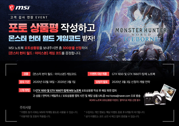 이번 이벤트는 3월 1일까지 2차 접수가 진행된다. 이벤트 대상 제품은 GTX 1650 및 GTX 1660Ti 탑재 MSI 노트북이며, 접수 기간 안에 구매한 제품의 포토상품평을 작성하면 응모가 가능하다. 당첨자에게는 '몬스터 헌터 : 월드' 기본 게임과 '아이스본' 확장팩이 포함된 코드를 증정한다.