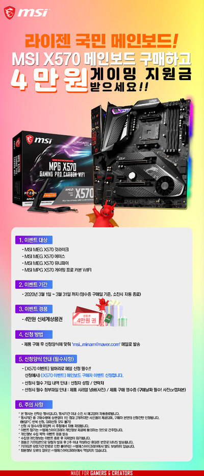 엠에스아이코리아는 MSI X570 메인보드 구매자를 대상으로 ‘4만원 신세계상품권’을 증정하는 이벤트를 진행한다.