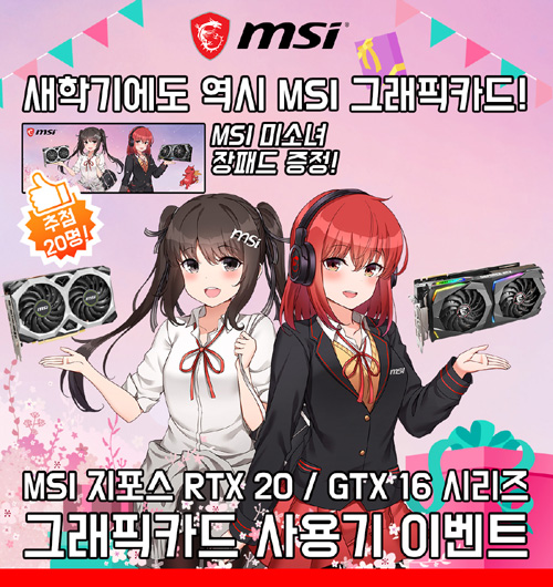 엠에스아이코리아는 MSI 지포스 RTX 20 SUPER / RTX 20 / GTX 16 SUPER / GTX 16 시리즈 그래픽카드의 사용기를 작성 유저에게 미소녀 장패드 선물을 증정하는 이벤트를 진행한다.