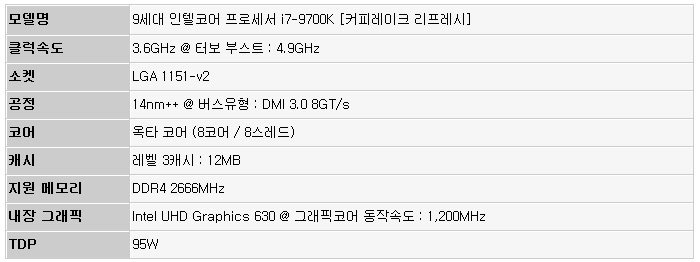 PC방에서 큰 인기를 끌고 있는 대표적인 게이밍 프로세서 인텔 i7-9700K은 헥사코어를 지원하던 전작들과 달리 8코어 8스레드로 구성되어 있으며 캐시도 12MB 로 늘어났다. 여기에 인텔 터보 부스트 테크놀로지 2.0 지원으로 최대 4.9GHz 의 높은 클럭으로 구동되며 이를 통해 게임이나 스트리밍 등에서 확연한 성능 향상을 경험할 수 있다.