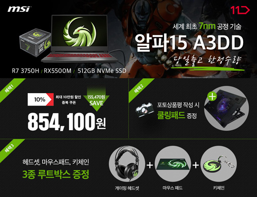 11번가에서 MSI 라이젠 게이밍 노트북 '알파15 A3DD' 구매 시 10% 최대 10만원 중복 할인쿠폰이 증정된다. 또 당일 발송을 지원하여, 오후 5시까지 제품을 구매하면 주문 당일 출고된다.