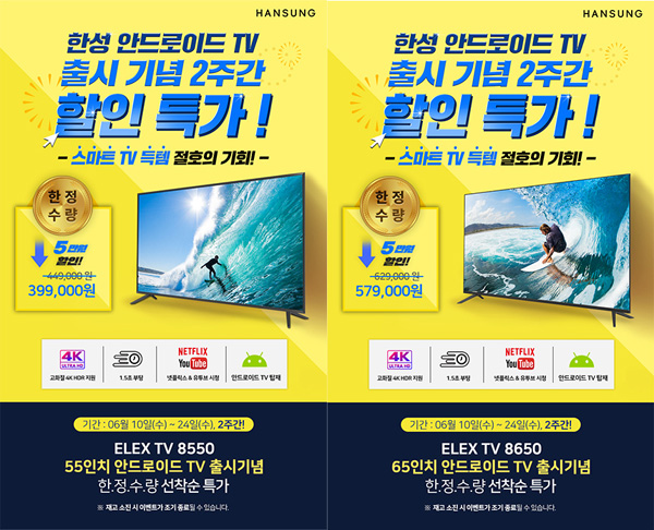 금번 한성컴퓨터 TV8550 / TV8650 제품은 출시기념, 자체 5만원 할인이라는 파격적인 특가를 진행하며, 한정수량으로 조기 종료될 수 있다. 구글 안드로이드 OS적용으로 더 풍성한 볼거리와 즐거움으로 가득찬 한성컴퓨터 신제품 2종은 한성 공식 홈페이지 및 온라인 판매처를 통해 만나볼 수 있다.