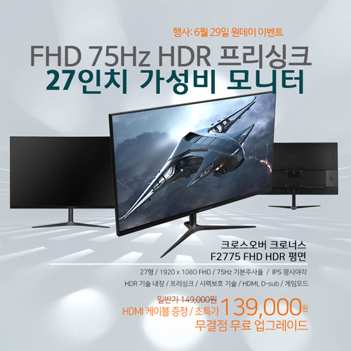 크로스오버존은 보급형 27형 모니터 '크로너스 F2775 FHD HDR 평면 무결점’을 대상으로 특가 이벤트를 펼친다. 행사는 6월 29일 월요일 옥션 올킬을 대상으로 진행된다. 행사 기간 동안 F2775 FHD HDR 평면 무결점은 행사가 139,000원에 판매된다. 기본 포함된 HDMI 케이블 외 HDMI 케이블을 하나 더 무료로 증정한다. 준비된 수량은 100개이며, 모두 소진되면 행사는 종료된다.