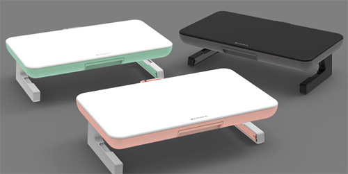EQUALE AP-2003 M-DESK 모니터 받침대는 블랙/그레이, 화이트/핑크, 화이트/민트의 투톤 디자인에 접이식 높이 조절과 수납 공간의 활용도로 사용자 편의성을 높였다.