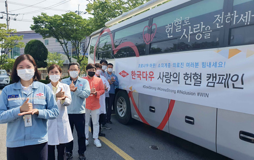 헌혈에 참여한 한국다우 직원들은 대한적십자사의 헌혈버스에 오르기 전에 발열검사와 손소독을 비롯해 헌혈 중에도 마스크를 지속 착용하는 등 감염병 예방 수칙을 철저히 준수했다.