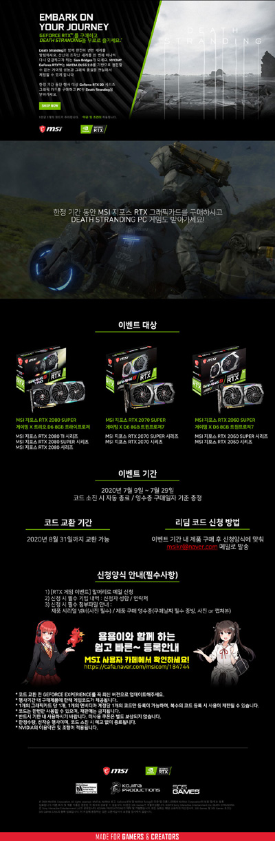 6만원 상당 경품인 ‘데스 스트랜딩’은 기존 게임과는 다른 혁신적인 컨셉으로 ‘레이 트레이싱’과 ‘DLSS 2.0’ 기술을 지원하여 압도적인 게이밍 성능과 현실감 넘치는 그래픽을 지원하여 많은 게이머들의 관심을 받고 있는 인기 게임이다. ‘MSI 지포스 RTX 20 SUPER 시리즈 / RTX 20 시리즈’ 그래픽카드를 구매 후 이벤트를 신청하는 고객은 게임 코드를 받을 수 있다. 게임 코드는 MSI 사용자 카페의 등록방법(https://cafe.naver.com/msicom/184744) 을 참고하여 게임으로 교환할 수 있다.