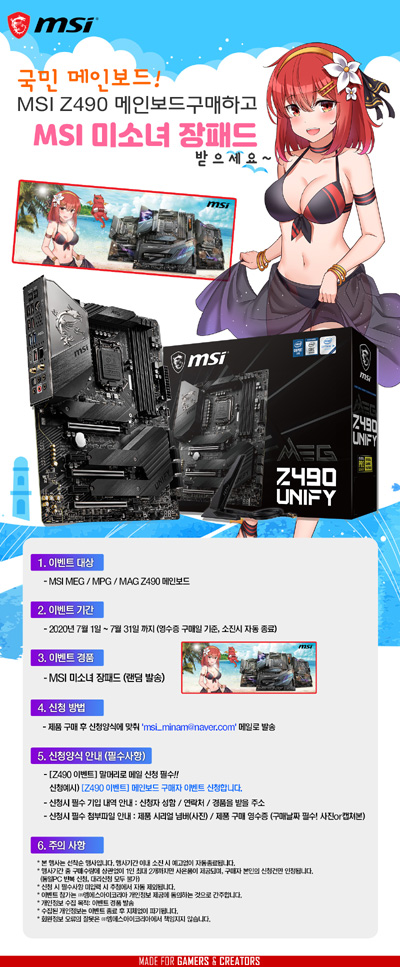 MSI Z490 메인보드 7월 구매자 이벤트는 7월 1일(수)부터 7월 31일(금)까지 진행하며(기간 중 구매 고객 대상, 경품 소진 시 자동 종료) 이벤트 기간 중 MSI Z490 메인보드를 구매한 모든 고객에게 ‘MSI 미소녀 장패드’를 선착순 증정한다. (단, 대상 제품 확인 필수)