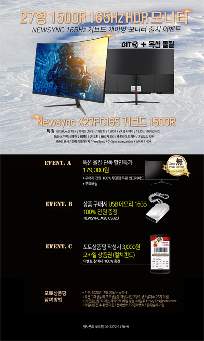옥션 올킬 단독으로 진행되는 이번 초특가 행사기간 동안 Newsync X27FC165 커브드 1500R 모니터는 179,000원 이라는 저렴한 가격에 판매된다. 구매자 전원에게 무료로 무결점 업그레이드를 진행해 발송한다. 이벤트 수량은 100대 한정이며 구매자의 부담을 덜기 위해 배송비는 무료로 진행된다. 이벤트 구매자 전원에게 16GB 용량의 USB 메모리를 증정하며, 포토상품평 작성시 3,000원 모바일 상품권도 선물한다.