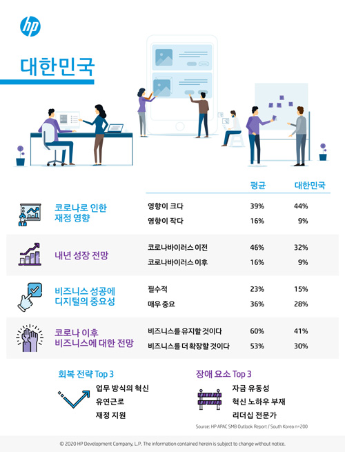 한국 중소기업의 경우, 다른 국가와 비교해 성장 전망 예측에 있어 다소 보수적인 입장을 보였다. 코로나 이후 성장 전망에 대한 질문에 9%의 응답기업 만이 성장할 것이라고 응답했으며, 코로나 이후 비즈니스 전망 역시 평균치를 밑도는 30% 만이 비즈니스를 확장할 수 있을 것이라고 답했다. 디지털의 중요성 역시 매우 중요하다는 의견이 28%로, 다른 지역과 비교해(36%) 상대적으로 낮은 수치를 보였다. 특히 기업 운용을 위한 자금에 대한 관심이 가장 높게 나타났다. 코로나로 인한 재정 영향이 크다는 답변이 평균 39%보다 높은 수치인 44%를 기록했으며, 향후 성장에 가장 큰 장애요소로 자금 유동성을, 코로나 이후 회복을 위한 전략 중 하나로도 재정 지원을 꼽았다.