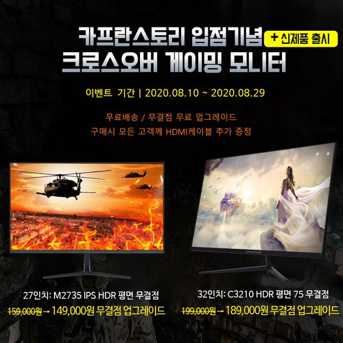 크로스오버는 32형, 27형 신제품 모니터 2종을 대상으로 네이버 카프란스토리 이벤트를 펼친다. 이번 행사는 크로스오버존 신모델 출시를 기념하기 위해 시작됐다. 이번 행사를 통해 제품을 구입하게 되면 무결점 무료 업그레이드 돼서 택배로 발송된다. 이때 택배는 무료로 발송된다.