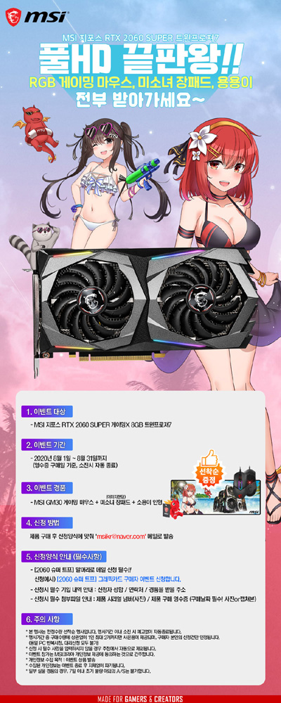 경품은 RGB와 다양한 게이밍 기능을 갖춘 ‘GM30 게이밍 마우스’와 MSI 미소녀가 그려진 장패드와 함께 MSI의 마스코트 용용이 인형까지 포함되어 있다. ‘MSI 지포스 RTX 2060 SUPER 게이밍X 트윈프로져7’ 그래픽카드를 구매 후 이벤트를 신청하면 경품을 모두 받을 수 있으며, 준비된 경품이 소진 시 행사는 자동으로 종료된다.