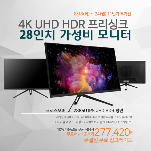 크로스오버존이 성능은 높이고 가격은 합리적인 수준으로 낮춘 28형 4K UHD 모니터인 ‘2885U IPS UHD HDR 평면’을 대상으로 특가 행사를 진행한다. 2885U IPS UHD HDR 평면 행사는 8월 18일부터 24일까지 11번가 특가전으로 진행된다. 이번 행사에서 10% 다운로드쿠폰을 내려 받을 수 있어 최종 실구매가 277,420원에 구입 가능하다.