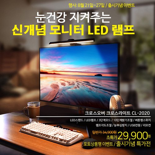 크로스오버존이 크로스라이트 CL-2020과 32SS PLUS QHD 75 HDR 평면 떡상 무결점을 대상으로 특가전을 진행한다. 먼저 8월 21일(금)~ 27일(목) 동안 네이버 스마트스토어에서 크로스라이트 CL-2020은 29,900원에 판매된다. 행사는 선착순 100대 한정으로 진행되며, 포토상품평 작성시 이마트 상품권 3,000원도 지급한다.