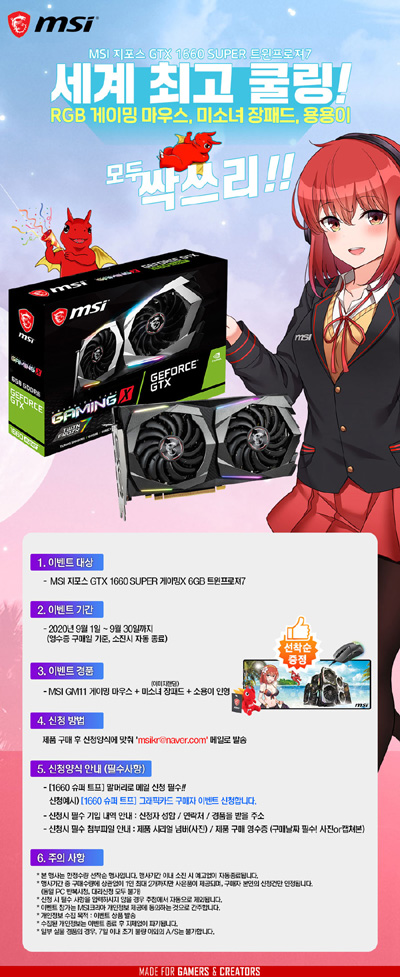 경품은 화려한 RGB가 탑재된 ‘GM11 게이밍 마우스’와 MSI 미소녀가 그려진 장패드와 함께 MSI의 마스코트 용용이 인형까지 포함되어 있다. ‘MSI 지포스 GTX 1660 SUPER 게이밍X 트윈프로져7’ 그래픽카드를 구매 후 이벤트를 신청하면 경품을 모두 받을 수 있으며, 준비된 경품이 소진 시 행사는 자동으로 종료된다.