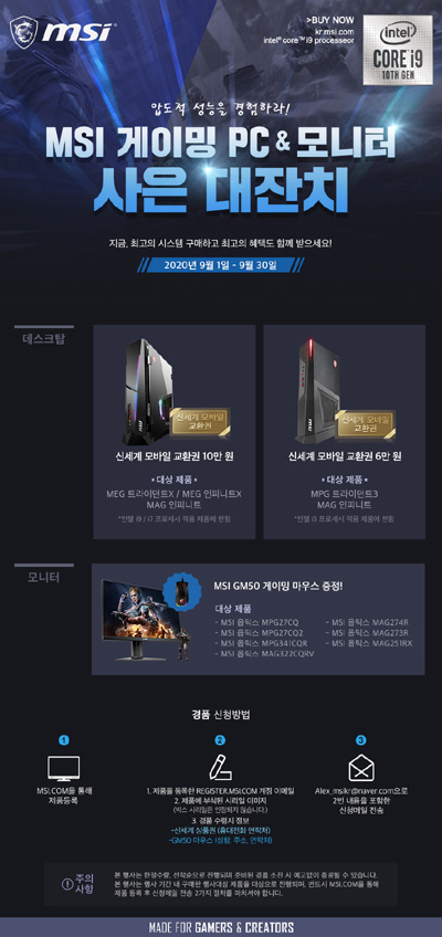 엠에스아이코리아는 MSI 게이밍PC와 모니터 구매 고객을 대상으로 신세계 상품권과 MSI 정품 게이밍 마우스를 증정하는 사은 이벤트를 연다. 2020년 9월 1일부터 9월 30일까지 진행되는 이번 이벤트는 행사 대상 MSI 게이밍 PC를 구매하면 최대 10만 원의 신세계 상품권을, 행사 대상 게이밍 모니터는 MSI 정품 게이밍 마우스, ‘GM50’이 사은품으로 제공될 예정이다.