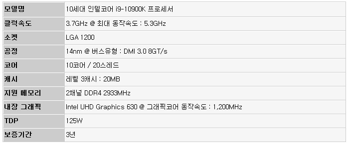 10세대 인텔코어 프로세서 i9-10900K는 9세대 최상위 프로세서 9900K 와 달리 10코어 20 스레드를 기본 지원한다. 높은 클럭 속도에 많은 코어와 스레드가 더해진 모델로 쾌적한 게이밍 환경을 구축할 수 있으며 영상 스트리밍이나 편집 등의 작업을 부드럽게 실행할 수 있다. 특히 인텔 써멀 벨로스트 부스트 사용시 최대 5.3GHz 로 동작하며 필요에 따라 동적으로 주파수를 증가시켜 속도를 높이는 인텔 터보부스트 기술이 적용되어 빠른 속도를 즐길 수 있다.