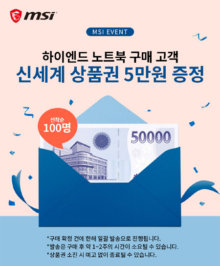 엠에스아이코리아는 MSI 하이엔드 노트북 구매 고객을 대상으로 신세계 상품권 5만원을 증정 이벤트를 진행한다.