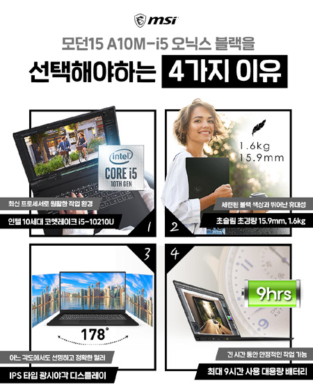 추천 가성비 상품으로 선정된 '모던15 A10M-i5 오닉스 블랙'은 인텔 10세대 i5-10210U 프로세서를 탑재하여 쾌적한 작업 환경을 제공한다. IPS 타입 광시야각 디스플레이로 다양한 각도에서도 선명한 화면을 확인할 수 있으며, 세련된 블랙 컬러와 15.9mm, 1.6kg 초슬림 초경량 디자인을 적용한 15.6인치 노트북이다.