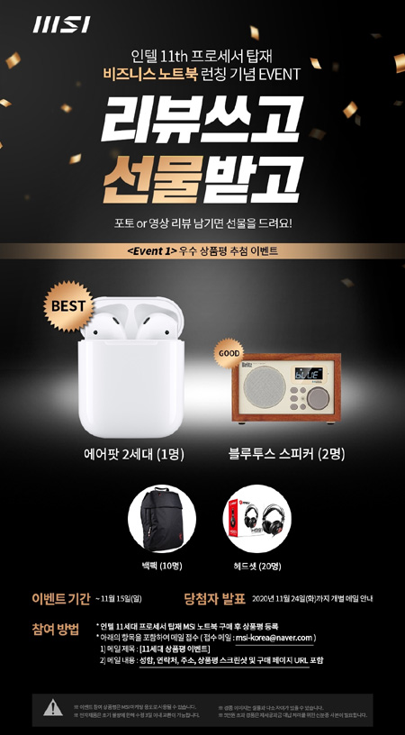 이벤트 접수는 2020년 11월 15일(일)까지 진행되며, 해당 제품은 인텔 11세대 프로세서 탑재 비즈니스 노트북 '프레스티지 14 Evo A11M', '써밋 B15 A11M', '모던15 A11M' 등이다. 참여 방법은 인텔 11세대 프로세서 탑재 MSI 노트북 구매 후 '성함, 연락처, 주소, 상품평 스크린샷, 구매 페이지 URL'을 포함하여 [11세대 상품평 이벤트] 제목으로 메일 접수( msi-korea@naver.com )하면 된다.