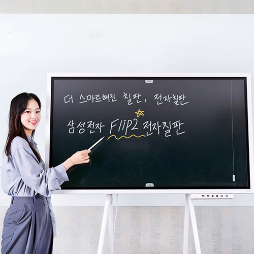 `삼성전자 전자칠판 플립2`는 업계 최고 수준의 필기 인식 기술을 적용한 터치스크린을 탑재하여 화면에 메모 레이어를 추가해 자유롭게 쓰고 지울 수 있으며, USB, HDMI, NFC, 스크린 미러링을 통해 다양한 IT 기기와 쉽게 데이터를 주고받을 수 있다.