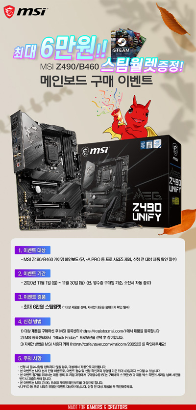 엠에스아이코리아는 MSI Z490, B460 메인보드 구매자를 대상으로 ‘어쌔신 크리드 발할라’를 비롯, 최대 15만원 상당의 다양한 게이밍 선물을 증정하는 이벤트를 진행한다. 이벤트 기간은 11월 10일(화)부터 12월 31일(목)까지로, 기간 내 이벤트 대상 메인보드를 구매한 고객은 모두 게임 코드를 받을 수 있다.