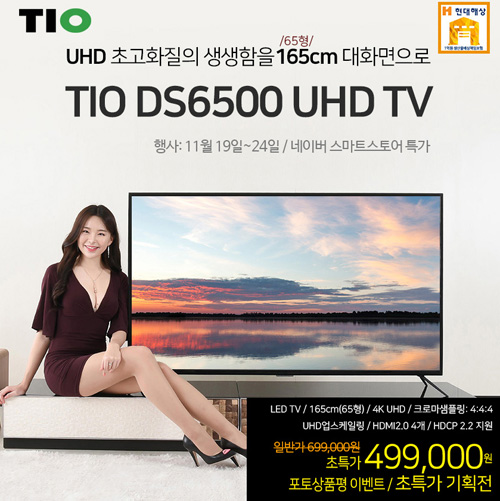 크로스오버존이 65형 대화면 UHD TV인 TIO DS6500 UHD TV를 대상으로 특가전을 진행한다. 11월19일(목) ~ 24일(화) 동안 네이버 스마트스토어에서 TIO DS6500 UHD TV는 특별한 가격인 499,000원에 판매된다.