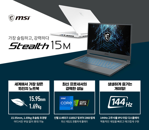 엠에스아이코리아는 슬림 게이밍 노트북 ‘Stealth 15M’을 출시했다. 신제품 MSI Stealth 15M A11SEK는 최신 인텔 11세대 타이거레이크 i7-1185G7 및 RTX 2060 고성능 그래픽을 탑재했다. 15.95mm 초슬림, 1.69kg 초경량 디자인으로 동급대비 얇은 15인치 게이밍 노트북이다. 어디서든 부담 없이 휴대 가능하며 9시간 이상 배터리 라이프로 안정적인 사용시간을 제공한다.