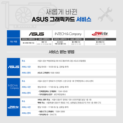 에이수스는 고객 서비스 만족도를 높이기 위해 10월 15일 이후 출시된 각 제품에 따라 공식 수입사인 인텍앤컴퍼니와 대원씨티에스를 통해서도 그래픽카드 서비스를 진행하고 있다.