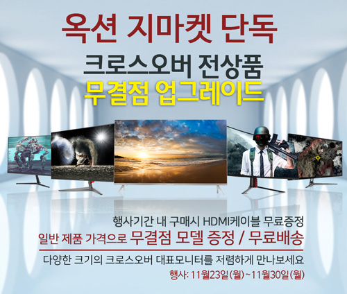 크로스오버는 24형부터 43형 까지 다양한 크기의 게이밍 모니터들을 대상으로 무결점 무료 업그레이드 이벤트를 펼친다. 이번 행사동안 크로스오버의 24, 27, 32, 34, 38, 43형, 고해상도, 고Hz, 평면, 커브드, 게이밍 등 다양한 모니터들이 저렴하게 판매된다.