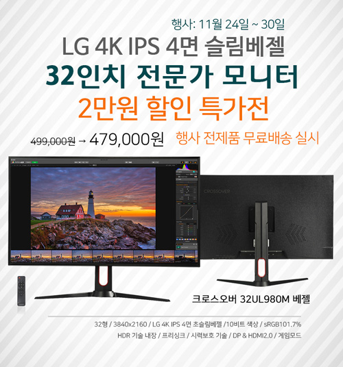 크로스오버는 32형 고해상도 4K UHD 모니터 ‘32UL980M HDR 프리미엄'을 대상으로 2만원 할인행사를 진행한다. 옥션 및 지마켓 단독으로 진행되는 이번 행사는 11월24일부터 30일까지 1주일간 진행되며, 행사 기간 동안 일반 제품은 2만원 할인된 가격에 판매된다. 배송비는 무료이며, 포토상품평 작성시 10,000원 신세계상품권을 증정하는 행사도 같이 열린다. 배송시 파손을 방지하기 위해 에어캡 안심포장을 튼튼하게 해서 발송한다.