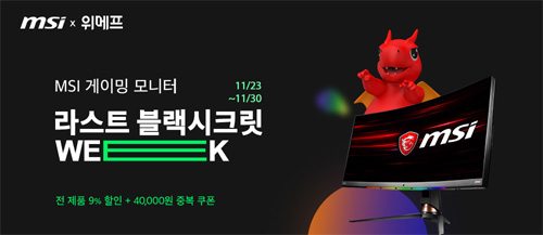 엠에스아이코리아는 위메프에서 MSI 게이밍 모니터 단독 기획전 ‘라스트 블랙 시크릿 위크’를 연다. 2020년 11월 29일까지 진행되는 이번 기획전에서는 2019년부터 2020년 2분기까지 6분기 연속 대한민국 프리미엄 게이밍 모니터 누적 판매량 1위에 오른 MSI 게이밍 모니터를 9% 기본 할인과 4만 원 중복 할인 쿠폰을 더한 조건으로 구매할 수 있다.