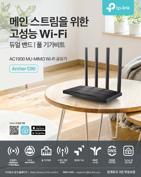 이 외에 안드로이드 또는 iOS 기기를 통해 네트워크를 설정할 수 있는 ‘TP-Link Tether’ 앱도 지원한다. 직관적인 웹 인터페이스를 가지고 있어 누구나 손쉽게 관리할 수 있는 부분도 장점이다. 티피링크가 새롭게 선보인 ‘Archer C80’ 무선 공유기는 3년 무상 보증 프로그램이 적용된다.