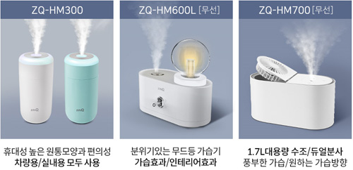 기본에 충실한 가습기 지니큐 미니가습기는 휴대성이 높고 이퀄라이져무드등에 차량용/실내용이 가능한 ZQ-HM300과 분위기 있는 무드등을 겸비한 ZQ-HM600L, 대용량 수조와 원하는 가습방향을 조절 할 수 있는 ZQ-HM700을 선보였다.