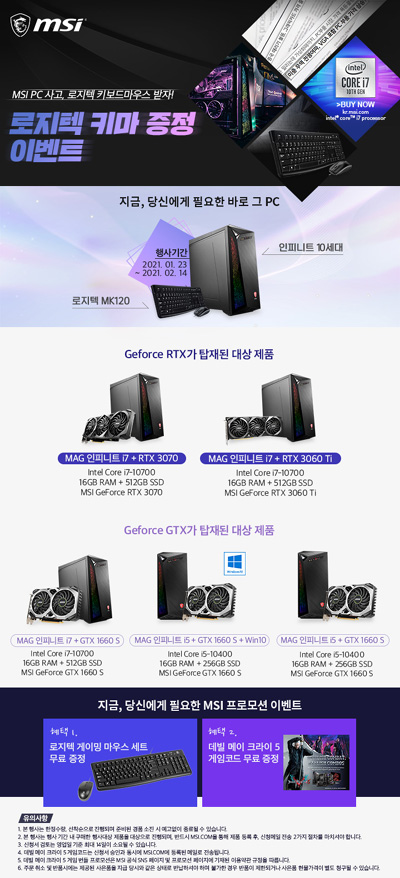 대상 제품으로는 간단한 설치와 쉬운 인터페이스로 사용자의 편의성을 높인 ‘MSI MAG 인피니트’ 시리즈로 다양한 구성의 그래픽카드 조합을 통해 사용자의 선택 폭을 넓혔다. 엔비디아 지포스 RTX 3070, 3060Ti와 인텔 10세대 코어 i7 프로세서 탑재 및 엔비디아 지포스 GTX 1660S와 인텔 10세대 코어 i7 및 i5 프로세서가 탑재되어 성능과 가격에 따라 소비자 개개인의 용도에 최적화된 맞춤형 PC 제품을 구매할 수 있다.