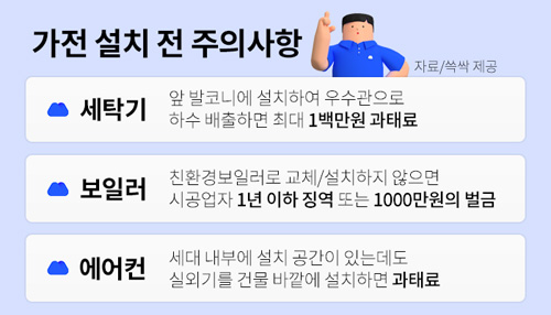 쓱싹에서 `가전제품 설치 시 주의사항`을 소개했다. 아파트나 공동 주택에서 흔히 베란다로 알고 있는 공간은 발코니이다. 빨래를 널 충분한 공간과 배수구가 있어 세탁기를 설치하기 적당한 곳으로 판단하기 쉽다. 하지만 빗물이나 눈 녹은 물을 내보내는 우수관으로 세제와 세탁물 찌꺼기가 섞인 생활 하수를 내보내면 불법이다.