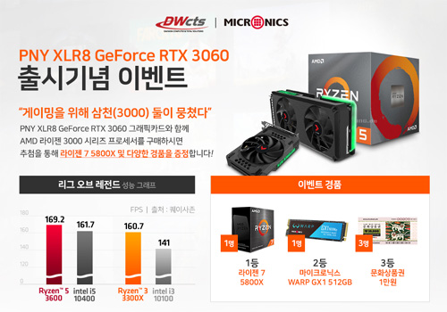 마이크로닉스는 앞서 출시한 PNY GeForce 그래픽카드와 마찬가지로 국내 소비자를 위해 제품 구매 후 1년 이내에 이상이 발생할 시 리퍼비시 제품이 아닌 새 제품 교환 서비스를 제공한다. 이 서비스는 PNY가 제품을 공급하는 전 세계 중 유일하게 대한민국에서만 진행되는 서비스로 국내 소비자들은 특별한 보증 혜택을 누릴 수 있게 됐다. 기본 무상 보증은 3년이다. 한편, 마이크로닉스는 대원CTS와 함께 PNY 지포스 RTX 3060 출시기념 이벤트를 진행한다. 자사 지포스 RTX 3060 그래픽카드와 AMD 라이젠 3000 시리즈 프로세서를 구매하면 추첨을 통해 한 명에게 라이젠 7 5800X 프로세서를 제공한다. 이 외에도 두 명에게 USB 메모리를, 세 명에게는 문화상품권 1만원권을 각각 제공한다.