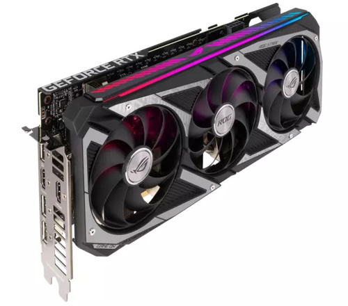 ROG STRIX GeForce RTX 3060 12GB는 금속 재질의 슈라우드와 오픈형 백플레이트를 바탕으로 단단한 외형과 더불어 RGB가 적용되어 ROG 특유의 감성이 추가되었다. Armoury Crate 소프트웨어를 통해 에이수스의 다른 부품들과 함께 사용 시 고유의 RGB 조명효과를 연출한다. 또한 에이수스의 고유 기술인 엑시얼 테크 팬(Axial-tech Fan)은 총 3개의 팬은 중앙과 양 사이드에 위치한 두 개의 팬이 각기 다른 방향으로 회전하여 보다 효율적인 공기 흐름을 형성해 팬 사이의 난류를 최소화한다. 기존 그래픽카드에서 확장된 2.7 슬롯 공간에는 대형 방열판을 통해 공기의 흐름을 효율적으로 활용할 수 있도록 하였으며 GPU에서 히트싱크로 열을 전달하기 위해 개별 공간과 더불어 MaxContact 기술을 사용했다. 또한 높은 성능에 맞게 최상급 커패시터, 초크, Super Alloy Power II의 내부 구성 요소로 수백 와트의 전원을 손쉽고 안정적으로 공급한다.