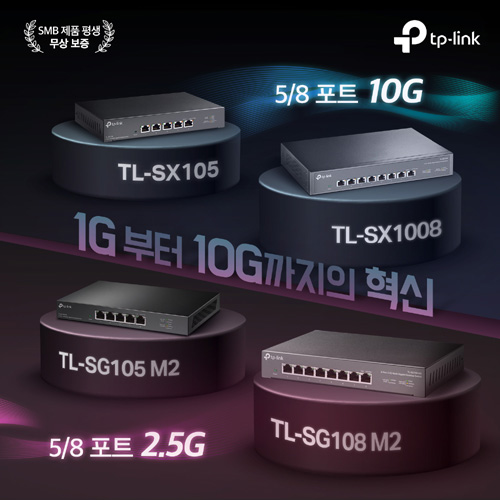 10G 모델인 TL-SX105와 TL-SX1008은 10기가비트를지원하는 5/8개의 포트를 갖추고 있으며, 최대 100/160Gbps의스위칭 용량을 각각 제공한다. 100Mbps/1G/2.5G/5G/10G의링크 속도를 자동으로 감지하며, 10G NAS와 10G 서버, 2.5G/5G/10GWi-Fi 6 AP, 8K 비디오 등 2.5G를포함한 모든 장치에서 최적의 성능을 지능적으로 조절해 준다.