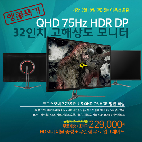 크로스오버존은 높은 인기를 누리고 있는 대표모니터 '크로스오버 32SS PLUS QHD 75 HDR 평면 떡상 무결점’을 대상으로 앵콜 특가 이벤트를 펼친다.