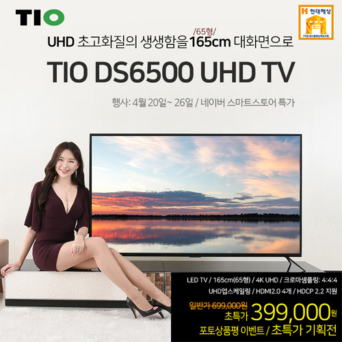 4월 20일(화)~ 26일(월) 동안 네이버스마트스토어에서 TIO DS6500 UHD TV는 특별한 가격인 399,000원에 판매된다. 행사는 선착순 100대 한정으로 진행되며, 포토상품평작성시 신세계 상품권 10,000원도 지급한다.