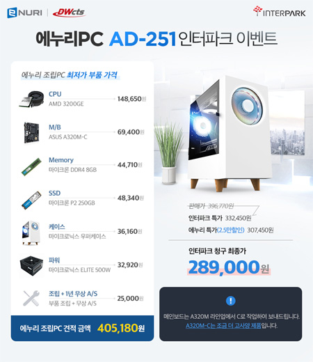 에누리 사무용PC AD-251은 사무용에 적합한 안정성과 기존 조립PC의 가성비를 동시에 충족하는 제품으로 다양한 강점이 있다. 공식수입사로서 본체 및 각 부품단위까지의 ONE STOP AS를 지원하며 에누리와 전략적 콜라보를 통한 최적의 특가로 구성되어 있다. 또한 조립PC로써 가성비만이 아닌, 안정성과 최상의 퍼포먼스를 발휘하는 100% 정품 구성이 돋보인다.