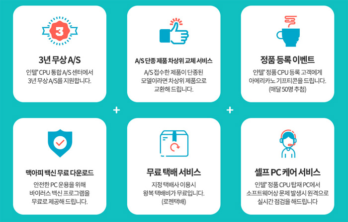 그에 반해 정품 프로세서를 구입하면 무상 3년 A/S를 지원해 CPU에 문제가 생겼을 경우 빠르게 조치를 받을 수 있다. 특히 A/S 접수시 제품이 단종되었을 경우 차상위 제품으로 교환하는 서비스도 진행하고 있다.