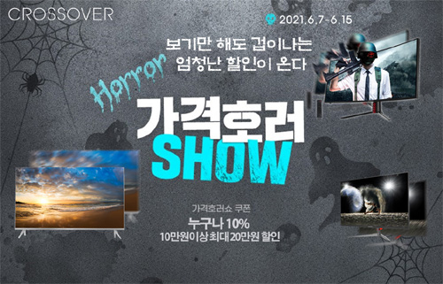 이번 행사동안 크로스오버의 포터블, 27, 32,34, 38, 43형 등 다양한 모니터들이 저렴하게 판매된다. 가격호러쇼 행사기간 동안 가격 호러쇼 쿠폰이발행되며, 이를 내려받으면 최대 10% 할인쿠폰을 사용할 수 있다. 행사기간은 6월 7일 월요일부터 15일 화요일까지다양하게 펼쳐진다. 크로스오버의 다양한 제품들을 저렴한 가격에 만나볼 수 있다.