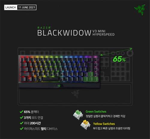 Razer BlackWidow V3 Mini HyperSpeed는 미니 사이즈의 키보드임에도 Razer의 우수한스위치 기술들이 집약돼 있다. 사운드 댐퍼가 장착된 조용한 리니어 타입의 옐로우 스위치와 클리키한 촉감의 경쾌한타건음을 선사하는 그린 스위치를 선택할 수 있다. 또 키보드에는 Razer Chroma RGB 조명을 키별로 설정할 수 있으며, 각인이 지워지지 않는 이중 사출 ABS 키캡으로 견고한 내구성과 긴 수명을 갖췄다.