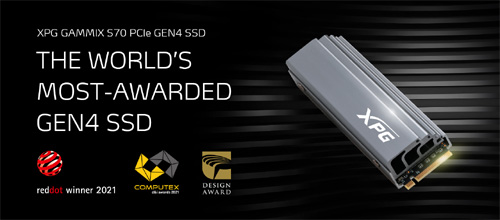 ADATA의 고성능 게이밍 기어 브랜드, XPG는 PCIe 4.0을 지원하는 XPG GAMMIX S70 M.2 NVMe 제품이 2021년 컴퓨텍스 d&i 어워드에서 수상을 했다.