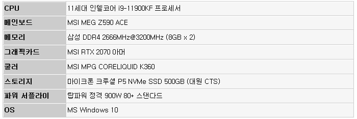 이번에는 11세대 인텔코어 프로세서 기반의 PC를 사용해 원할하게 최신 게임을 플레이 할 수 있는지 살펴보도록 하자. 테스트에는 최상위 11세대 인텔코어 프로세서 i9-11900KF 와 3200MHz 로 오버클럭된 8GB x 2 DDR4 메모리, RTX 2070 그래픽카드 등이 사용 되었으며 수냉 쿨러를 적용해 CPU에서 발생하는 열을 빠르게 식혀주었다. (CPU는 오버클럭 하지 않고 테스트를 진행했다.)