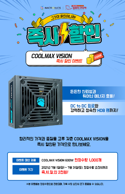 마이크로닉스는 자사 파워서플라이 라인업 중 가성비를 갖춘 쿨맥스 비전(COOLMAX VISION) 600W에 대한 가격 할인 이벤트를 진행한다. 컴퓨터코리아와 함께 한정수량 진행되는 이벤트를 통해 가성비 높은 파워서플라이를 더욱 합리적인 가격에 구매 가능할 것으로 예상된다.